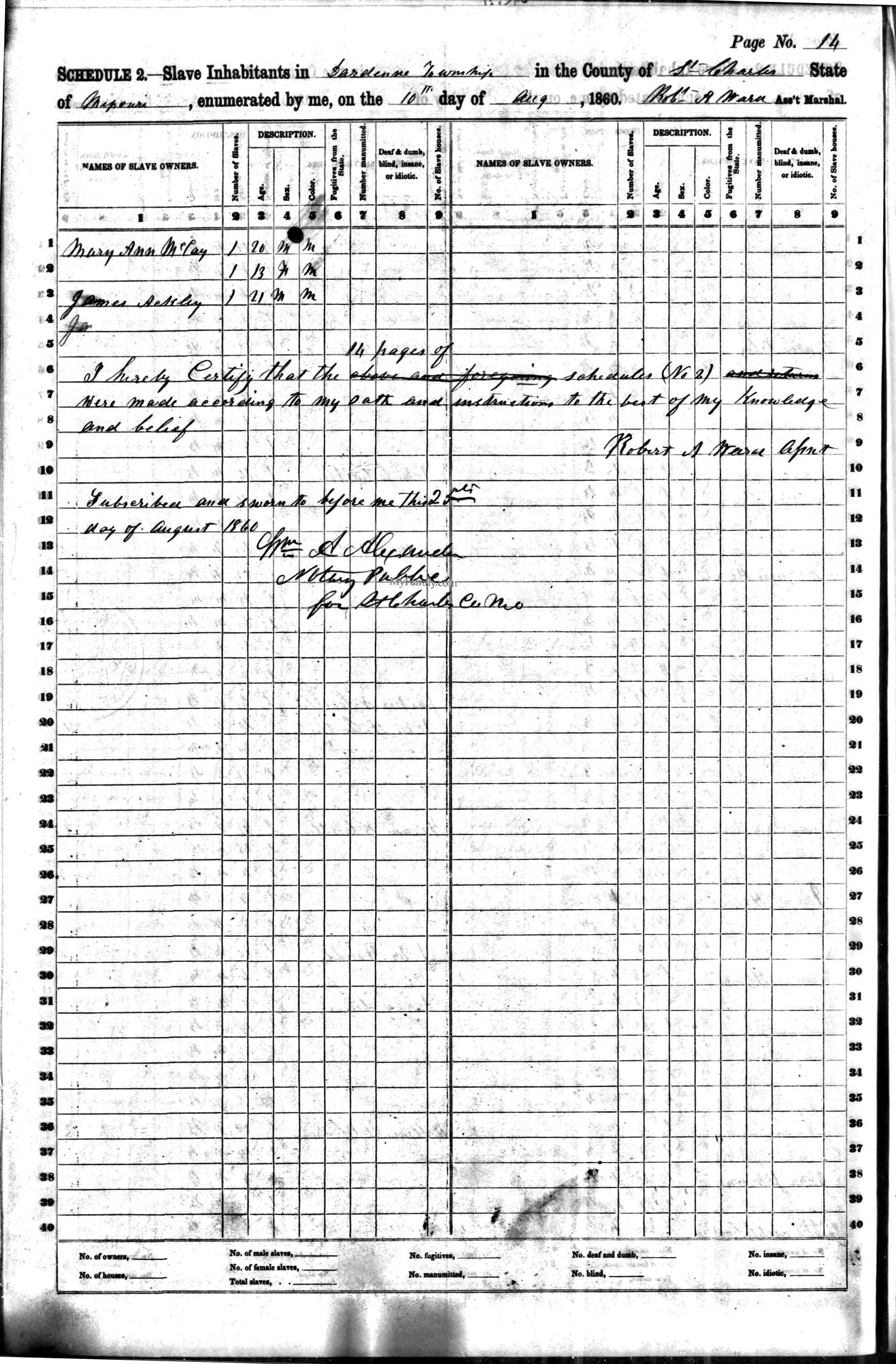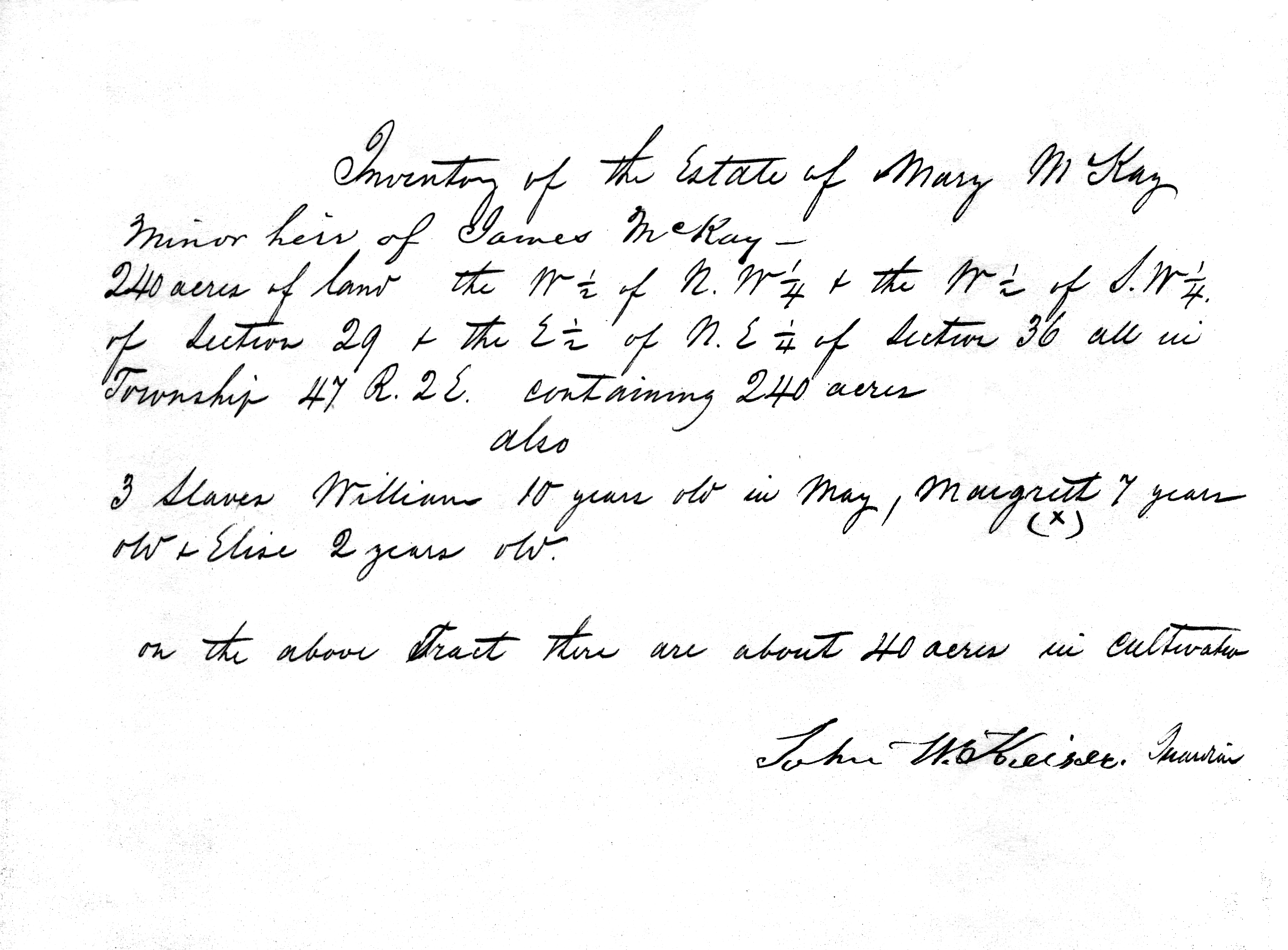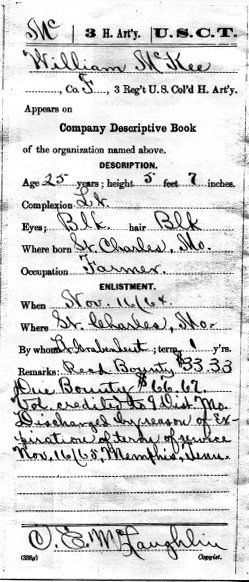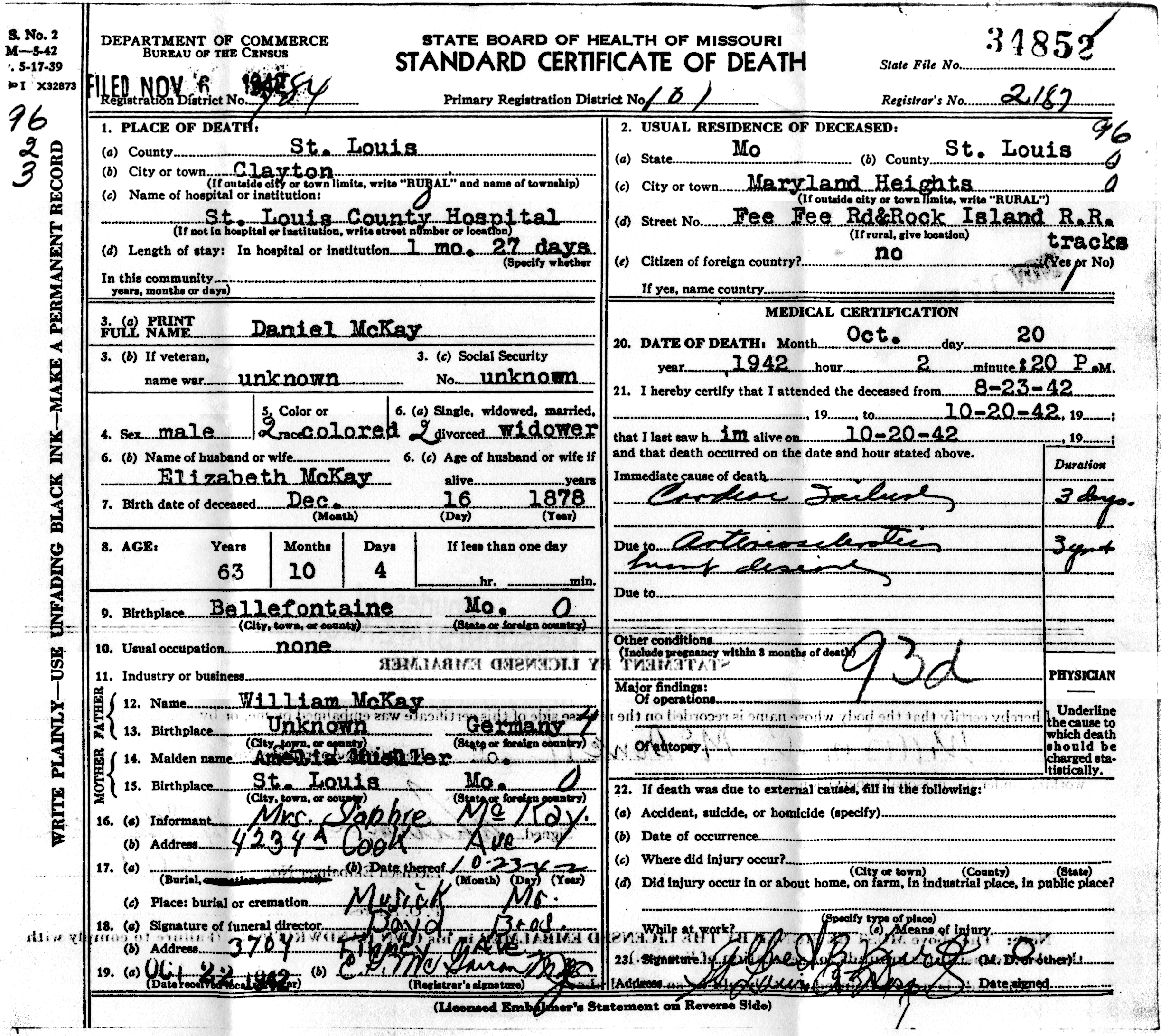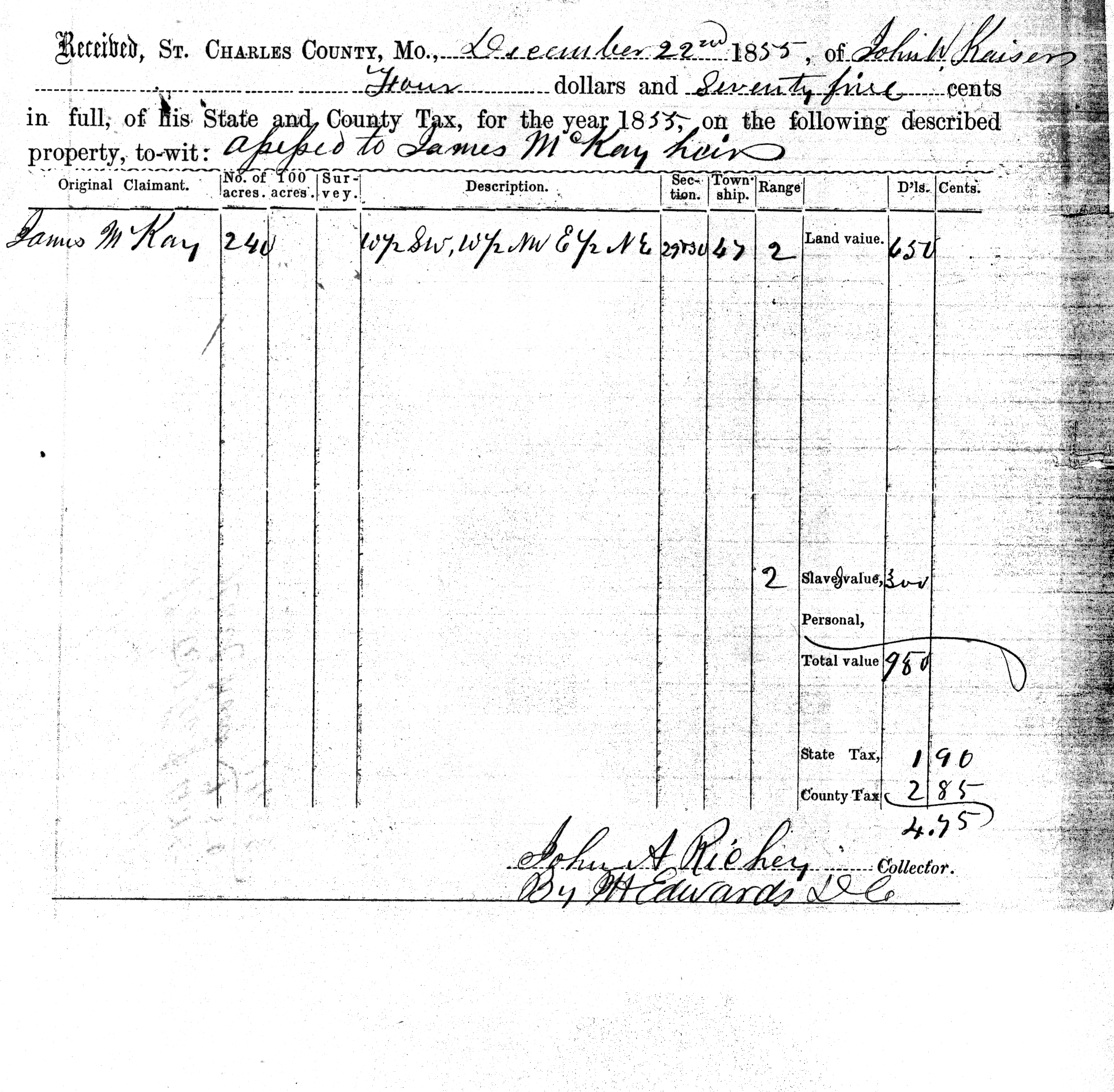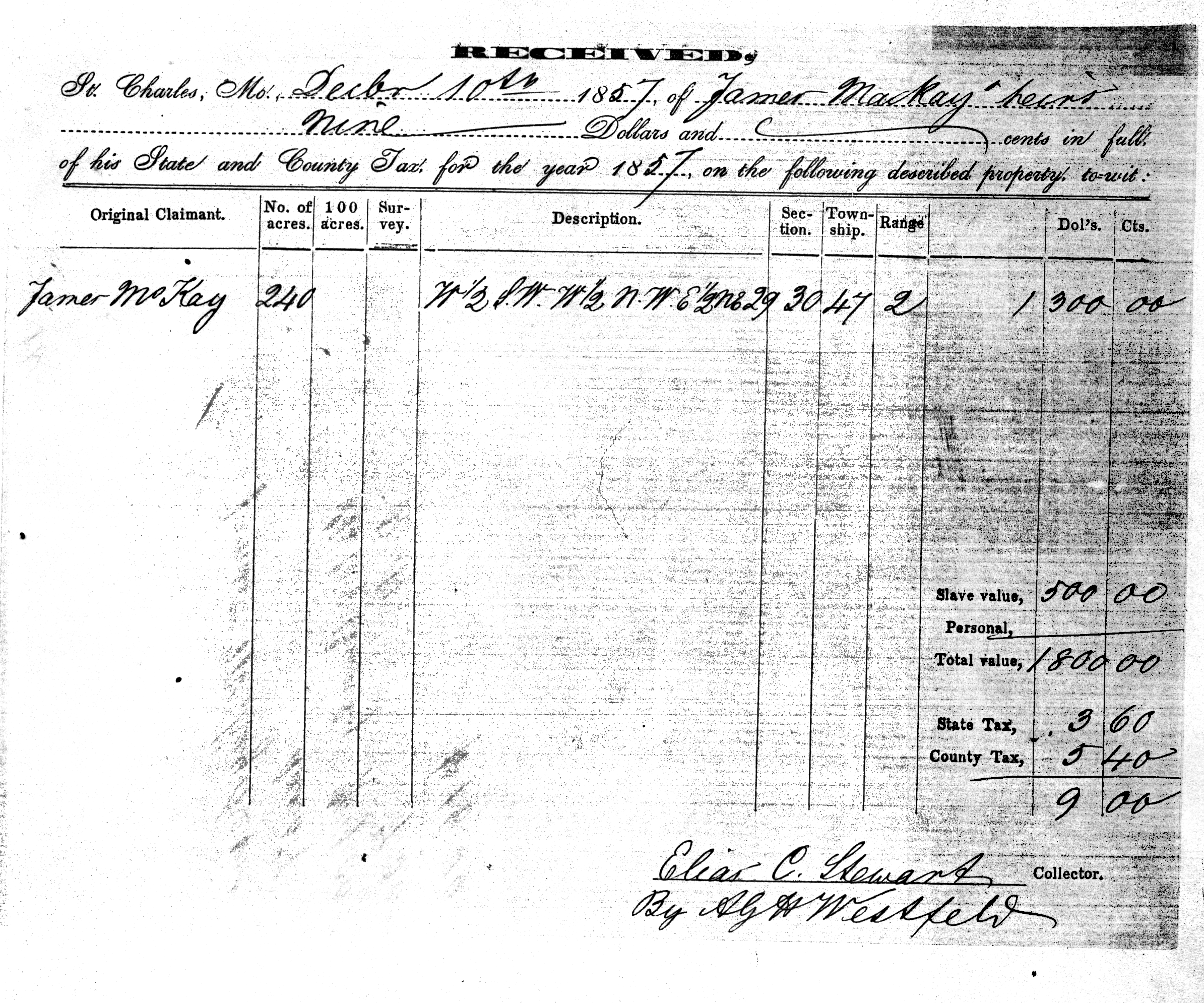 [Home] [Robert Mackay Clan Links and Information] [The Origins of William McKay & Family]The Origins of William McKay & Family (Page 16)Documents1831 James M. McKay Land Purchase Certificate 21 Nov 1831 1831 James M. McKay Land Purchase Receipt 1831 deeds of sale Dee Ann identified in the Forum Oct. 29, 2008 in which Asa McKay, Edith McKay & John Green McKay sold their land to Jacob McKay and Samuel Wilson on 9 September 1831. James and Edith bought their land in St. Charles, Missouri on 28 Nov 1831. 1831 Asa McKay to Jacob McKay Deed 9 Sep 1831 1831 Asa McKay to Samuel Wilson Deed 9 Sep 1831 Edith McKay's marriage in 1833. 1833 Edith McKay and Archibald Caruthers Marriage James M. McKay's Patent 1835 James M. McKay Land Purchase Patent 2 September 1835 Rosina Pfaar Immigration record 1840 Census for Jas McKay in Cuivre Township, St. Charles County James and Rosinah's Marriage license 1841 James McKay and Rosinah Pfarr Marriage 19 October 1841 1842 medical bill for James McKay prior to his death sometime on or after February 14th 1842 James McKay Medical Billing Rosina McKay named administrator of James McKay's estate and his sister, Edy Caruthers and brother, John Green McKay are identified 1842 Rosina McKay Administrator 17 March 1842 James McKay estate inventory--William (Bill), his mother Harriet and sister Margaretha, are identified on pg. 2 1842 James McKay Inventory (page 1) 25 March 1842 1842 James McKay Inventory (page 2) 25 March 1842 1842 James McKay Inventory (page 3) 25 March 1842 James McKay's widow's (Rosina) marriage to John Keiser in 1843. 1843 John Kiser and Rosina McKay Marriage John Keiser requested partition of slaves between James McKay's widow and child, Mary Ann in 1847. 1847 John Keiser Partition Request The partition distribution names the slaves in 1847--"Boy Bill" is distributed to Mary Ann. 1847 Slave Partition and Distribution The partition distribution is approved by Robert Miller P. C. judge. 1847 Slave Partition Probate Approval Inventories of Mary Ann McKay's property and administrative charges in 1849 1849 Mary McKay Inventory Charges 1849 Mary McKay Inventory Property 1850 census for Edith McKay Caruthers and John G. McKay 1850 Edith and A. R. Caruthers & John G. McKay Census 1850 census for John & Rosina Keiser and Mary Ann McKay John Wm. Keiser and Mary Ann McKay Census 1850 slave schedule for "John W. Keizer"--p.1 is William (12 year old male), Margaretha (7 year old female), p.2 is Elisa (2 year old female) Slaves for "Margt Taggart" are also listed on p.1--some or all of the Taggart slaves became the property of Robert Miller who was identified as the father of William's wife, Amelia Taggart McKay 1850 John W. Keizer Slave Schedule (part 1) 1850 John W. Keizer Slave Schedule (part 2) 1852 William's sister Margaretha died in St. Louis, apparently while serving George Keiser--the brother or other relative of John Keiser. 1855 & 1857 Slave & property tax bills for William, Elisa and 240 acres of land. 1855 Slave and Property Tax December 1857 Slave and Prop Tax December 1860 census for John & Rosina Keiser and Mary Ann McKay. 1860 John W. Keiser Mary Ann McKay Census 1860 slave schedule with "Mary Ann McCay" the owner of a 20 year old male and 12 year old female (William & Elisa). 1860 MAry Ann McCay Slave Schedule 1864-1865 William's enlistment into the U.S. Army and muster records in the McKee surname for F Company, 3rd Regiment, U.S. Colored Troops, Heavy Artillery. 1864 USCT Descriptive List William McKee Picture of William McKee's name on plaque A-8 at African American Civil War Memorial in Washington D.C.--which honors over 209,000 "Colored" soldiers and sailors who served the Union. 1865 St. Charles County marriage record--not recorded until 1889; official copy 1865 William McKee and Emilia Tigert Marriage 1870 census for William McKay--wife's name "Ella", Ballwin, St. Louis County 1880 census for William McKay--wife's name "Jane", Bonhomme Township, St. Louis County 1889 & 1891 Amelia McKee's Widow's Pension Declarations 1889 Widows Pension Declaration 1889 Widows Pension Marriage Record 1891 Widows Pension Declaration 1900 census for Amelia McKee and sons John, William, Dan (my grandfather) and Louis 1900 Emilia McKee and sons Census 1916 Letter sent by "Jennie McKee" to Dept. of Interior notifying them that Amelia McKee had died and "Jennie McKay" as informant on "Amelia McKay's" two death certificates. The death certificates also show her father to be Robert Miller. 1916 Widows Pensioner Deceased 1916 Amelia McKay Deceased (1) 1916 Amelia McKay Deceased (2) 1917 death certificate for Mary Ann McKay Hillenkamp, the daughter of James McKay 1917 Mary Ann McKay Hillenkamp Deceased 1920 census of my grandparents, Daniel & Elizabeth (Lizzie) McKay, with my father Julius and his siblings--Maryland Heights, St. Louis County, Missouri 1942 death certificate of my grandfather Daniel McKay--the informant was my Aunt Sophia and she indicated that Daniel's father, William, was born in Germany. I believe this myth was created because William grew up in a household and community of German immigrants and he probably learned German language and culture which caused his descendants to mistakenly believe William was German. Sophia also stated that Amelia's maiden name was "Mueller" which seems to be the German spelling of "Miller." 1860 census and slave schedule for Robert Miller--identified as the father of Amelia Taggart (aka Miller) McKay Robert Miller 1860 Slave Schedule
