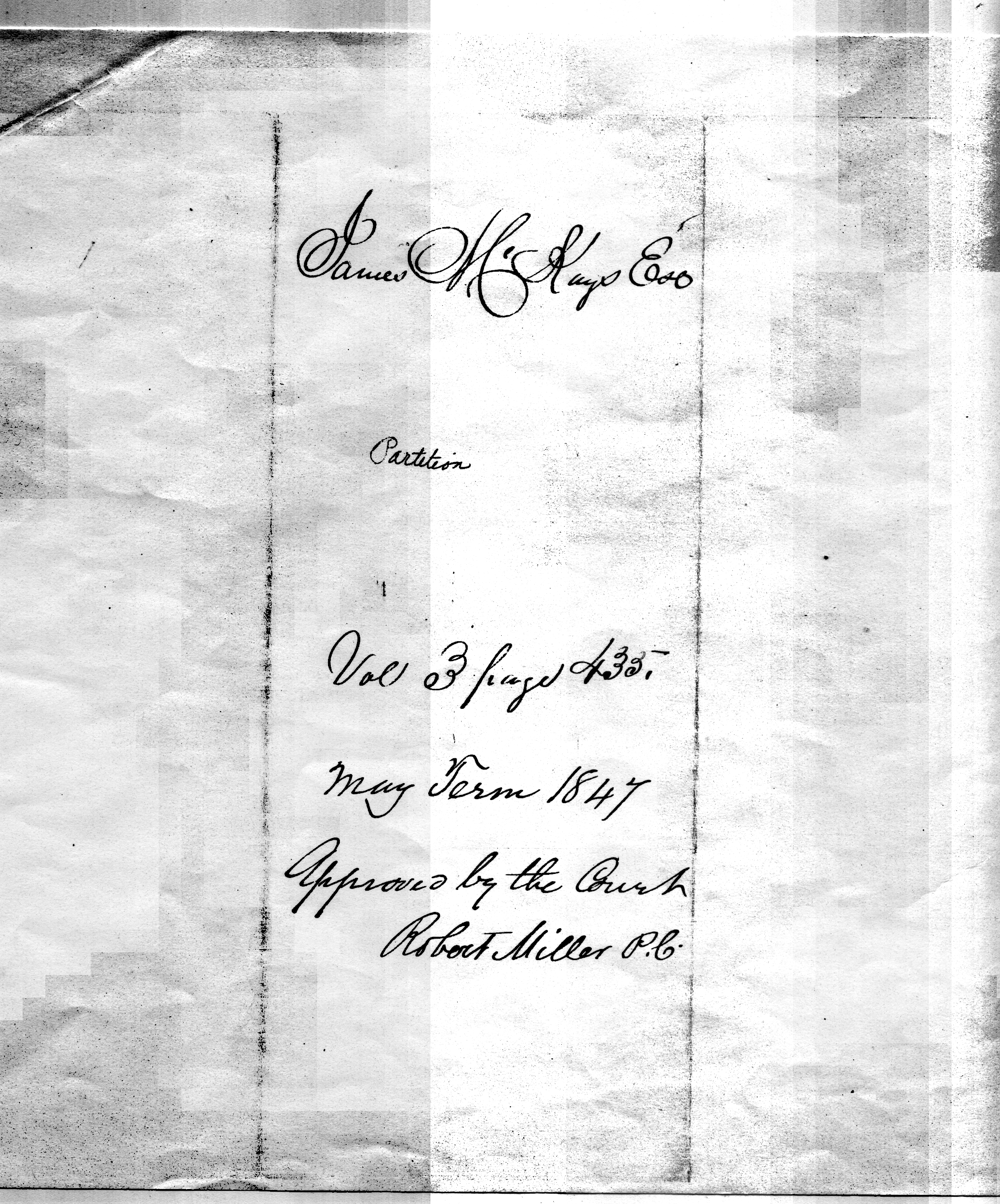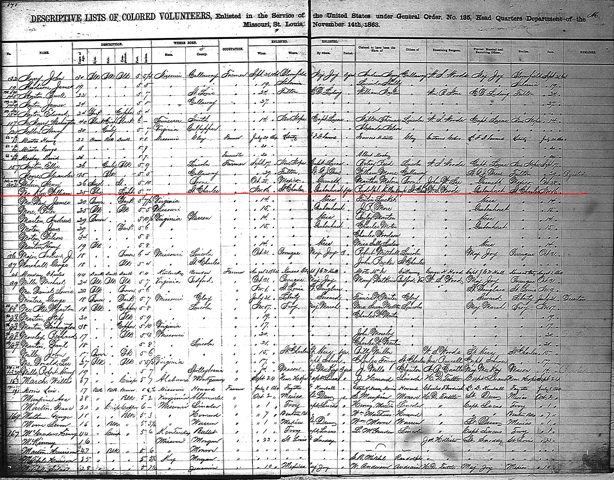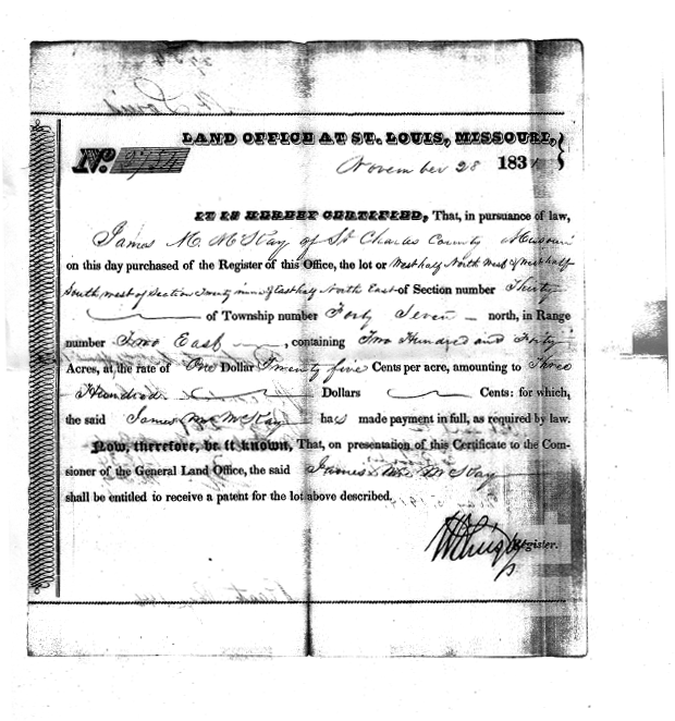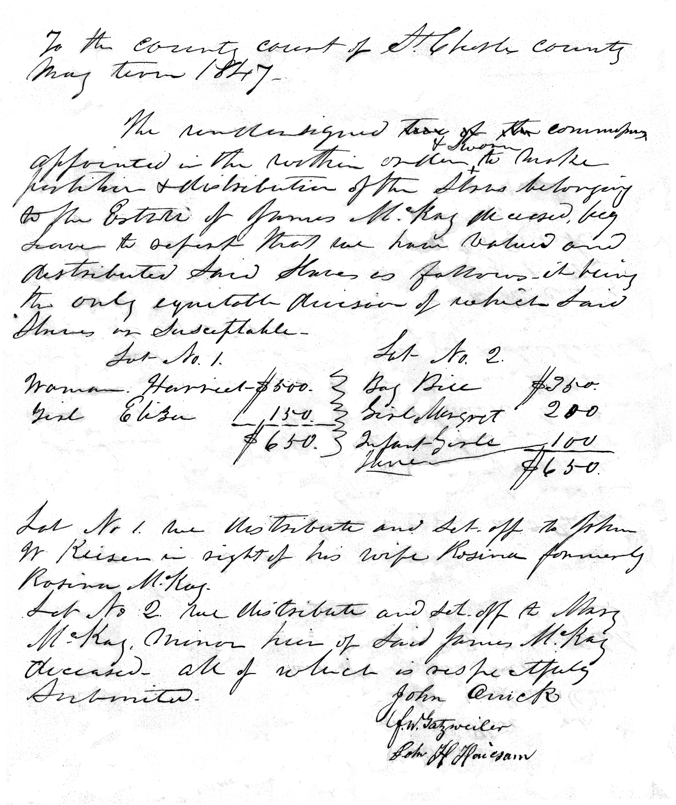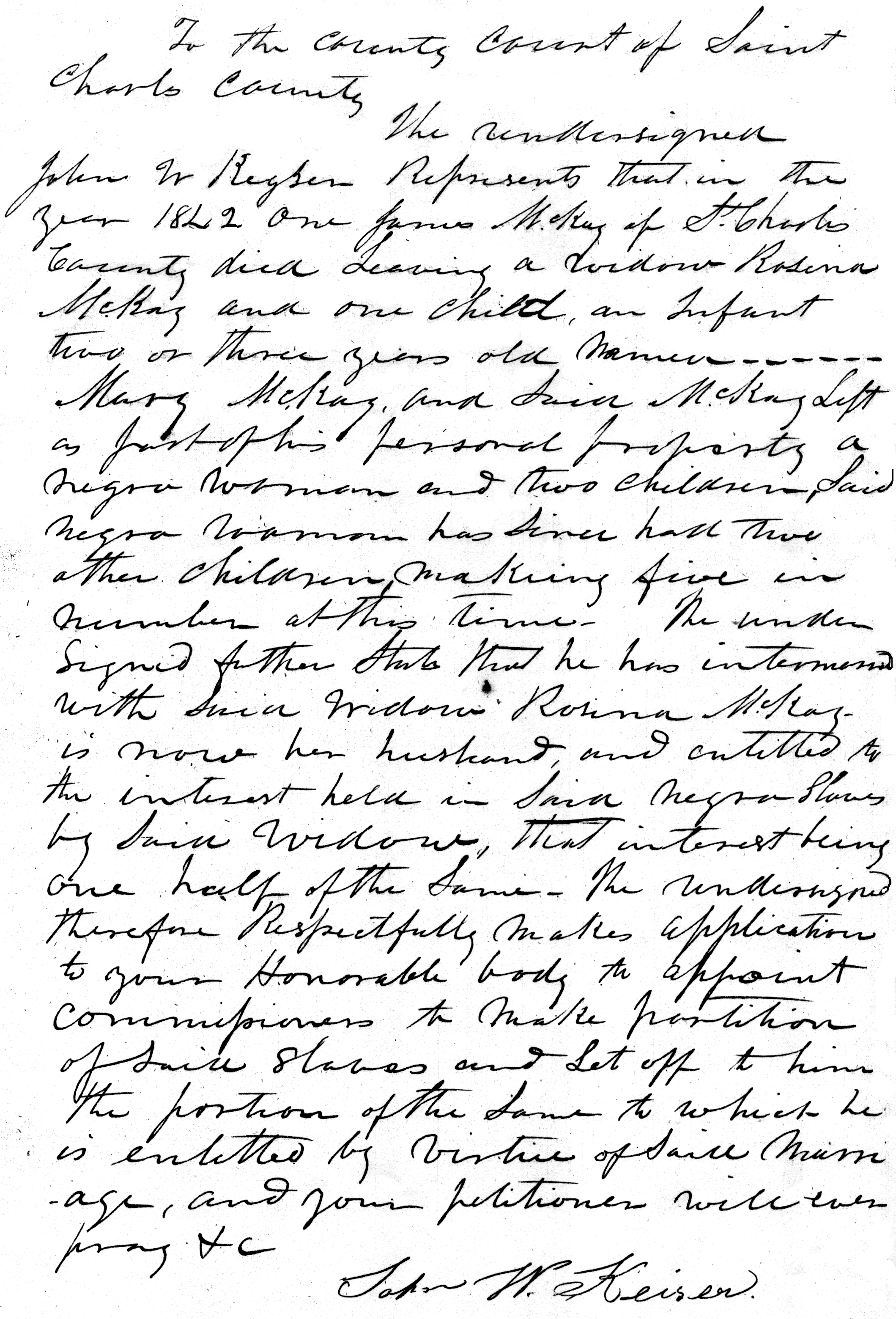 [Home] [Robert Mackay Clan Links and Information] [The Origins of William McKay & Family]The Origins of William McKay & Family (Page 16)Documents1831 James M. McKay Land Purchase Certificate 21 Nov 1831 1831 James M. McKay Land Purchase Receipt 1831 deeds of sale Dee Ann identified in the Forum Oct. 29, 2008 in which Asa McKay, Edith McKay & John Green McKay sold their land to Jacob McKay and Samuel Wilson on 9 September 1831. James and Edith bought their land in St. Charles, Missouri on 28 Nov 1831. 1831 Asa McKay to Jacob McKay Deed 9 Sep 1831 1831 Asa McKay to Samuel Wilson Deed 9 Sep 1831 Edith McKay's marriage in 1833. 1833 Edith McKay and Archibald Caruthers Marriage James M. McKay's Patent 1835 James M. McKay Land Purchase Patent 2 September 1835 Rosina Pfaar Immigration record 1840 Census for Jas McKay in Cuivre Township, St. Charles County James and Rosinah's Marriage license 1841 James McKay and Rosinah Pfarr Marriage 19 October 1841 1842 medical bill for James McKay prior to his death sometime on or after February 14th 1842 James McKay Medical Billing Rosina McKay named administrator of James McKay's estate and his sister, Edy Caruthers and brother, John Green McKay are identified 1842 Rosina McKay Administrator 17 March 1842 James McKay estate inventory--William (Bill), his mother Harriet and sister Margaretha, are identified on pg. 2 1842 James McKay Inventory (page 1) 25 March 1842 1842 James McKay Inventory (page 2) 25 March 1842 1842 James McKay Inventory (page 3) 25 March 1842 James McKay's widow's (Rosina) marriage to John Keiser in 1843. 1843 John Kiser and Rosina McKay Marriage John Keiser requested partition of slaves between James McKay's widow and child, Mary Ann in 1847. 1847 John Keiser Partition Request The partition distribution names the slaves in 1847--"Boy Bill" is distributed to Mary Ann. 1847 Slave Partition and Distribution The partition distribution is approved by Robert Miller P. C. judge. 1847 Slave Partition Probate Approval Inventories of Mary Ann McKay's property and administrative charges in 1849 1849 Mary McKay Inventory Charges 1849 Mary McKay Inventory Property 1850 census for Edith McKay Caruthers and John G. McKay 1850 Edith and A. R. Caruthers & John G. McKay Census 1850 census for John & Rosina Keiser and Mary Ann McKay John Wm. Keiser and Mary Ann McKay Census 1850 slave schedule for "John W. Keizer"--p.1 is William (12 year old male), Margaretha (7 year old female), p.2 is Elisa (2 year old female) Slaves for "Margt Taggart" are also listed on p.1--some or all of the Taggart slaves became the property of Robert Miller who was identified as the father of William's wife, Amelia Taggart McKay 1850 John W. Keizer Slave Schedule (part 1) 1850 John W. Keizer Slave Schedule (part 2) 1852 William's sister Margaretha died in St. Louis, apparently while serving George Keiser--the brother or other relative of John Keiser. 1855 & 1857 Slave & property tax bills for William, Elisa and 240 acres of land. 1855 Slave and Property Tax December 1857 Slave and Prop Tax December 1860 census for John & Rosina Keiser and Mary Ann McKay. 1860 John W. Keiser Mary Ann McKay Census 1860 slave schedule with "Mary Ann McCay" the owner of a 20 year old male and 12 year old female (William & Elisa). 1860 MAry Ann McCay Slave Schedule 1864-1865 William's enlistment into the U.S. Army and muster records in the McKee surname for F Company, 3rd Regiment, U.S. Colored Troops, Heavy Artillery. 1864 USCT Descriptive List William McKee Picture of William McKee's name on plaque A-8 at African American Civil War Memorial in Washington D.C.--which honors over 209,000 "Colored" soldiers and sailors who served the Union. 1865 St. Charles County marriage record--not recorded until 1889; official copy 1865 William McKee and Emilia Tigert Marriage 1870 census for William McKay--wife's name "Ella", Ballwin, St. Louis County 1880 census for William McKay--wife's name "Jane", Bonhomme Township, St. Louis County 1889 & 1891 Amelia McKee's Widow's Pension Declarations 1889 Widows Pension Declaration 1889 Widows Pension Marriage Record 1891 Widows Pension Declaration 1900 census for Amelia McKee and sons John, William, Dan (my grandfather) and Louis 1900 Emilia McKee and sons Census 1916 Letter sent by "Jennie McKee" to Dept. of Interior notifying them that Amelia McKee had died and "Jennie McKay" as informant on "Amelia McKay's" two death certificates. The death certificates also show her father to be Robert Miller. 1916 Widows Pensioner Deceased 1916 Amelia McKay Deceased (1) 1916 Amelia McKay Deceased (2) 1917 death certificate for Mary Ann McKay Hillenkamp, the daughter of James McKay 1917 Mary Ann McKay Hillenkamp Deceased 1920 census of my grandparents, Daniel & Elizabeth (Lizzie) McKay, with my father Julius and his siblings--Maryland Heights, St. Louis County, Missouri 1942 death certificate of my grandfather Daniel McKay--the informant was my Aunt Sophia and she indicated that Daniel's father, William, was born in Germany. I believe this myth was created because William grew up in a household and community of German immigrants and he probably learned German language and culture which caused his descendants to mistakenly believe William was German. Sophia also stated that Amelia's maiden name was "Mueller" which seems to be the German spelling of "Miller." 1860 census and slave schedule for Robert Miller--identified as the father of Amelia Taggart (aka Miller) McKay Robert Miller 1860 Slave Schedule