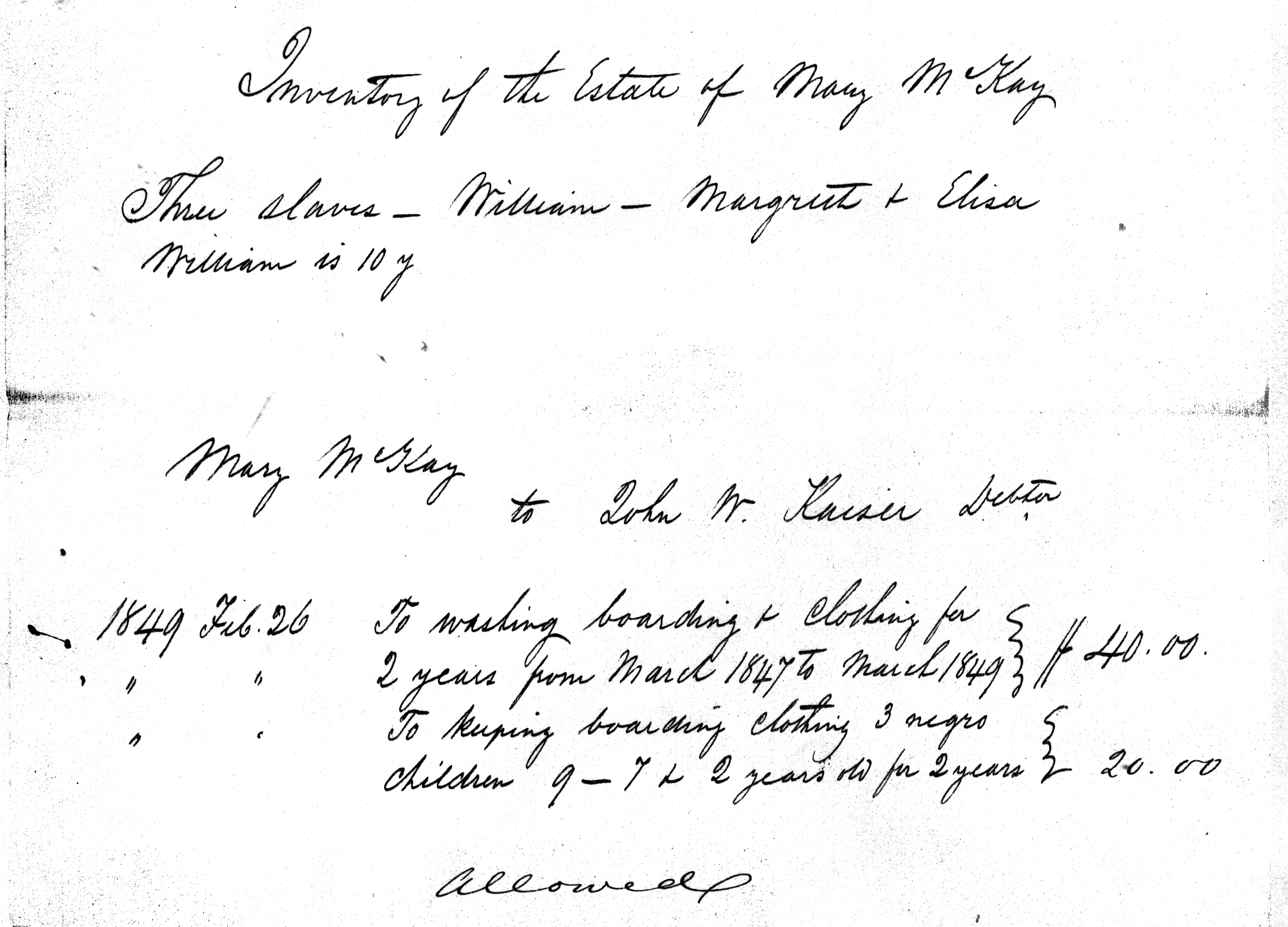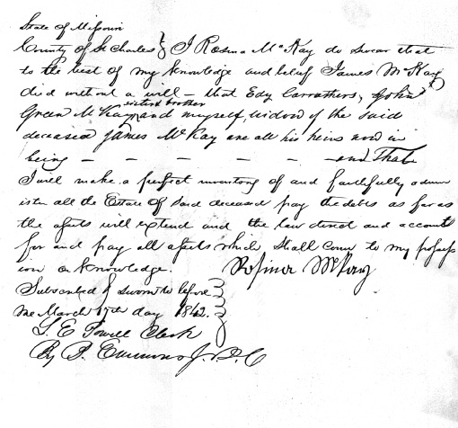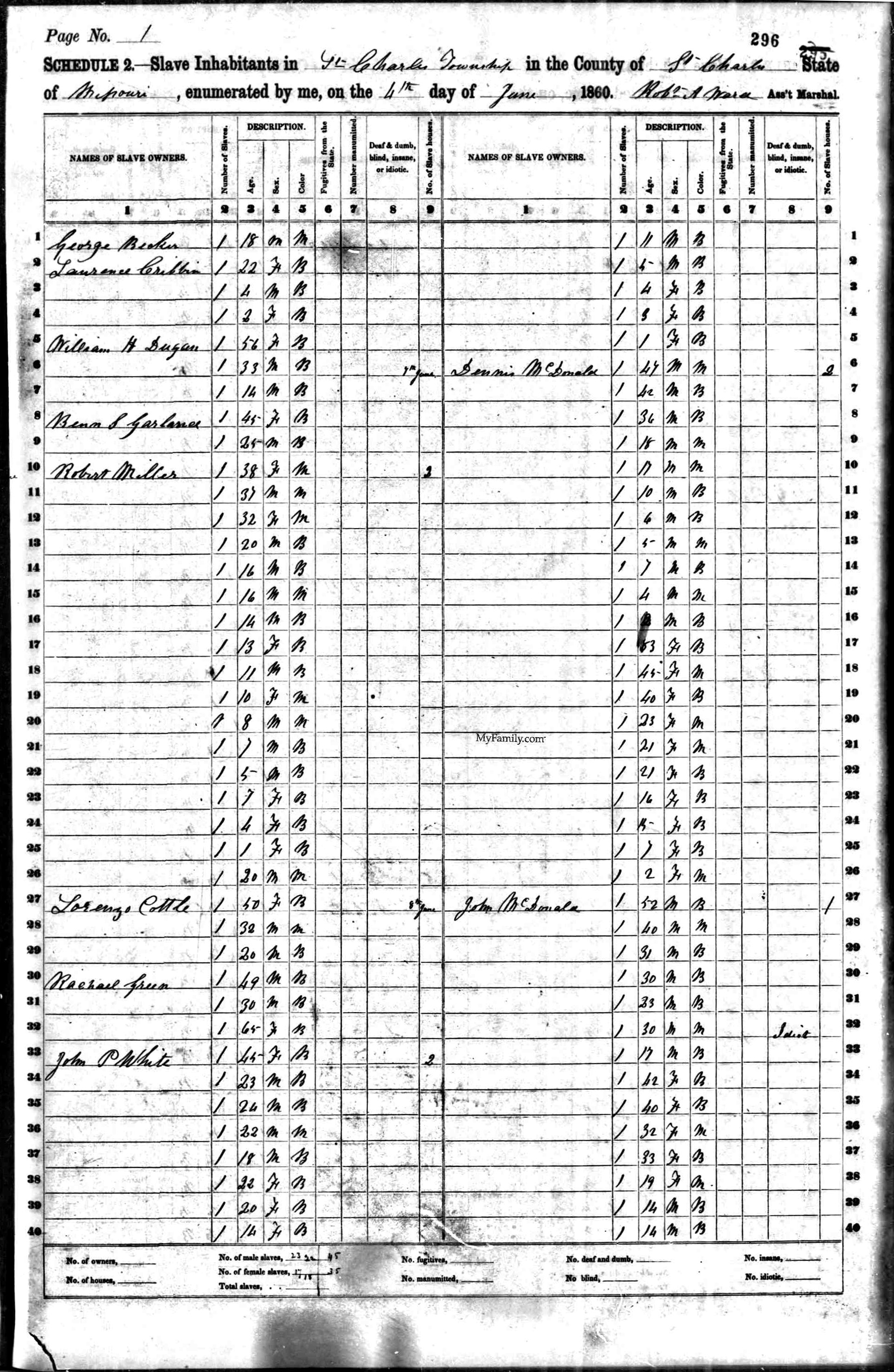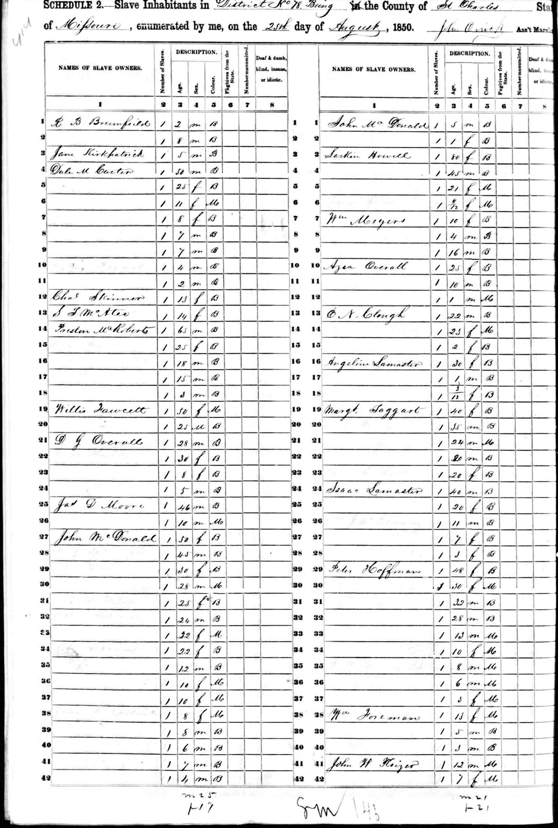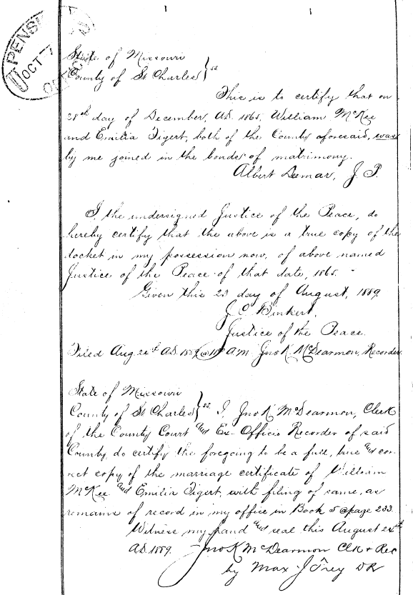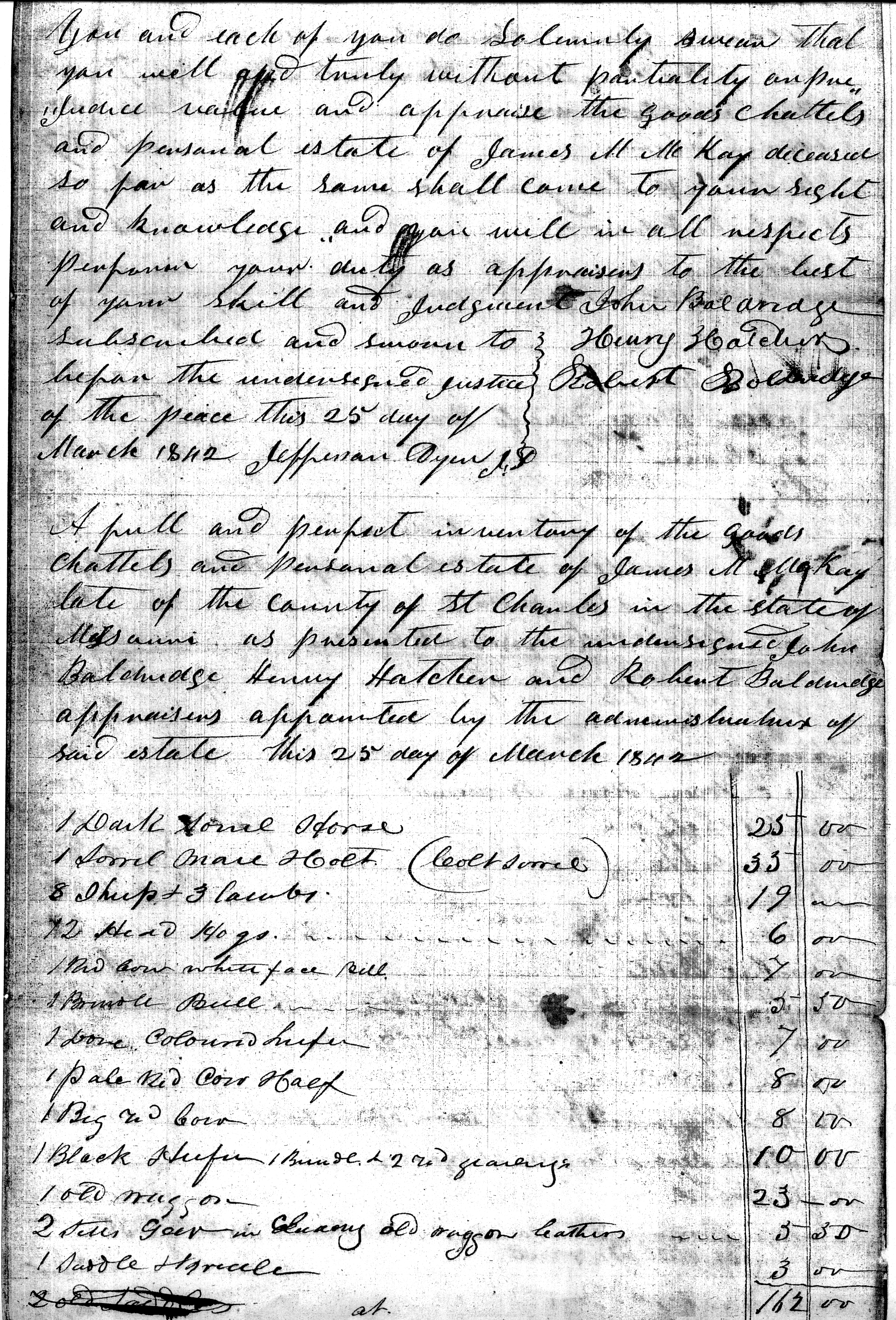 [Home] [Robert Mackay Clan Links and Information] [The Origins of William McKay & Family]The Origins of William McKay & Family (Page 16)Documents1831 James M. McKay Land Purchase Certificate 21 Nov 1831 1831 James M. McKay Land Purchase Receipt 1831 deeds of sale Dee Ann identified in the Forum Oct. 29, 2008 in which Asa McKay, Edith McKay & John Green McKay sold their land to Jacob McKay and Samuel Wilson on 9 September 1831. James and Edith bought their land in St. Charles, Missouri on 28 Nov 1831. 1831 Asa McKay to Jacob McKay Deed 9 Sep 1831 1831 Asa McKay to Samuel Wilson Deed 9 Sep 1831 Edith McKay's marriage in 1833. 1833 Edith McKay and Archibald Caruthers Marriage James M. McKay's Patent 1835 James M. McKay Land Purchase Patent 2 September 1835 Rosina Pfaar Immigration record 1840 Census for Jas McKay in Cuivre Township, St. Charles County James and Rosinah's Marriage license 1841 James McKay and Rosinah Pfarr Marriage 19 October 1841 1842 medical bill for James McKay prior to his death sometime on or after February 14th 1842 James McKay Medical Billing Rosina McKay named administrator of James McKay's estate and his sister, Edy Caruthers and brother, John Green McKay are identified 1842 Rosina McKay Administrator 17 March 1842 James McKay estate inventory--William (Bill), his mother Harriet and sister Margaretha, are identified on pg. 2 1842 James McKay Inventory (page 1) 25 March 1842 1842 James McKay Inventory (page 2) 25 March 1842 1842 James McKay Inventory (page 3) 25 March 1842 James McKay's widow's (Rosina) marriage to John Keiser in 1843. 1843 John Kiser and Rosina McKay Marriage John Keiser requested partition of slaves between James McKay's widow and child, Mary Ann in 1847. 1847 John Keiser Partition Request The partition distribution names the slaves in 1847--"Boy Bill" is distributed to Mary Ann. 1847 Slave Partition and Distribution The partition distribution is approved by Robert Miller P. C. judge. 1847 Slave Partition Probate Approval Inventories of Mary Ann McKay's property and administrative charges in 1849 1849 Mary McKay Inventory Charges 1849 Mary McKay Inventory Property 1850 census for Edith McKay Caruthers and John G. McKay 1850 Edith and A. R. Caruthers & John G. McKay Census 1850 census for John & Rosina Keiser and Mary Ann McKay John Wm. Keiser and Mary Ann McKay Census 1850 slave schedule for "John W. Keizer"--p.1 is William (12 year old male), Margaretha (7 year old female), p.2 is Elisa (2 year old female) Slaves for "Margt Taggart" are also listed on p.1--some or all of the Taggart slaves became the property of Robert Miller who was identified as the father of William's wife, Amelia Taggart McKay 1850 John W. Keizer Slave Schedule (part 1) 1850 John W. Keizer Slave Schedule (part 2) 1852 William's sister Margaretha died in St. Louis, apparently while serving George Keiser--the brother or other relative of John Keiser. 1855 & 1857 Slave & property tax bills for William, Elisa and 240 acres of land. 1855 Slave and Property Tax December 1857 Slave and Prop Tax December 1860 census for John & Rosina Keiser and Mary Ann McKay. 1860 John W. Keiser Mary Ann McKay Census 1860 slave schedule with "Mary Ann McCay" the owner of a 20 year old male and 12 year old female (William & Elisa). 1860 MAry Ann McCay Slave Schedule 1864-1865 William's enlistment into the U.S. Army and muster records in the McKee surname for F Company, 3rd Regiment, U.S. Colored Troops, Heavy Artillery. 1864 USCT Descriptive List William McKee Picture of William McKee's name on plaque A-8 at African American Civil War Memorial in Washington D.C.--which honors over 209,000 "Colored" soldiers and sailors who served the Union. 1865 St. Charles County marriage record--not recorded until 1889; official copy 1865 William McKee and Emilia Tigert Marriage 1870 census for William McKay--wife's name "Ella", Ballwin, St. Louis County 1880 census for William McKay--wife's name "Jane", Bonhomme Township, St. Louis County 1889 & 1891 Amelia McKee's Widow's Pension Declarations 1889 Widows Pension Declaration 1889 Widows Pension Marriage Record 1891 Widows Pension Declaration 1900 census for Amelia McKee and sons John, William, Dan (my grandfather) and Louis 1900 Emilia McKee and sons Census 1916 Letter sent by "Jennie McKee" to Dept. of Interior notifying them that Amelia McKee had died and "Jennie McKay" as informant on "Amelia McKay's" two death certificates. The death certificates also show her father to be Robert Miller. 1916 Widows Pensioner Deceased 1916 Amelia McKay Deceased (1) 1916 Amelia McKay Deceased (2) 1917 death certificate for Mary Ann McKay Hillenkamp, the daughter of James McKay 1917 Mary Ann McKay Hillenkamp Deceased 1920 census of my grandparents, Daniel & Elizabeth (Lizzie) McKay, with my father Julius and his siblings--Maryland Heights, St. Louis County, Missouri 1942 death certificate of my grandfather Daniel McKay--the informant was my Aunt Sophia and she indicated that Daniel's father, William, was born in Germany. I believe this myth was created because William grew up in a household and community of German immigrants and he probably learned German language and culture which caused his descendants to mistakenly believe William was German. Sophia also stated that Amelia's maiden name was "Mueller" which seems to be the German spelling of "Miller." 1860 census and slave schedule for Robert Miller--identified as the father of Amelia Taggart (aka Miller) McKay Robert Miller 1860 Slave Schedule