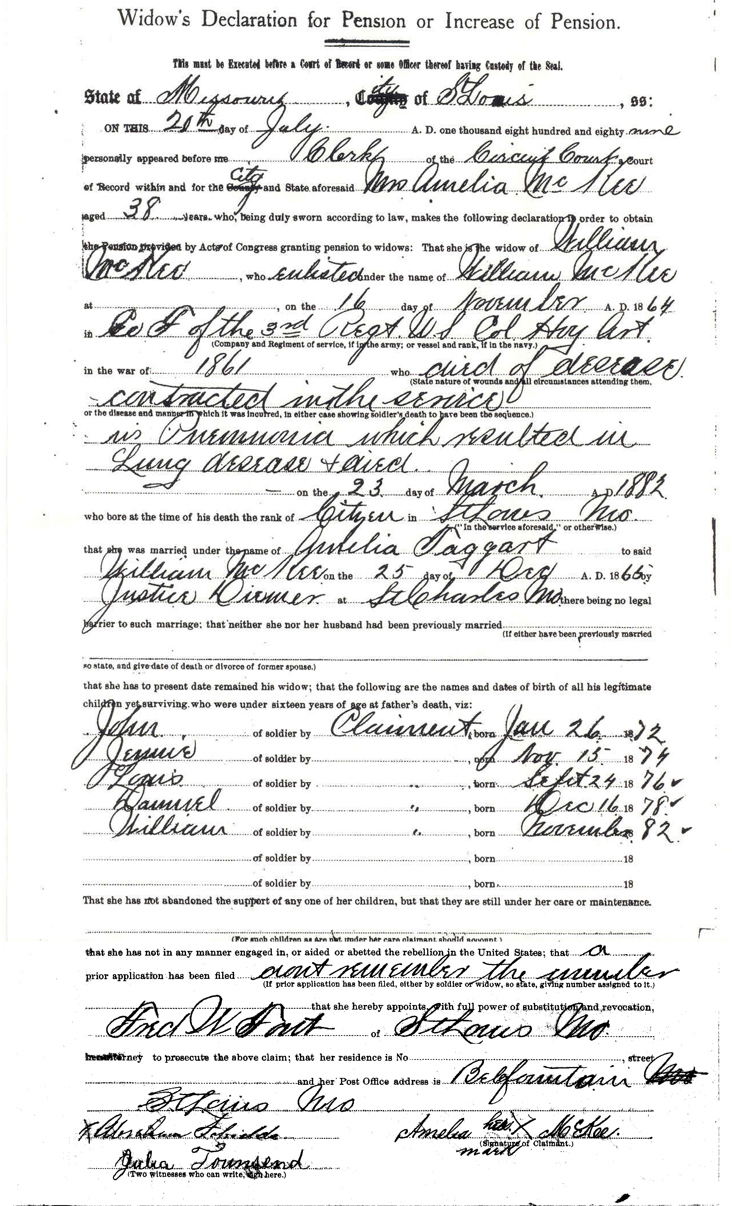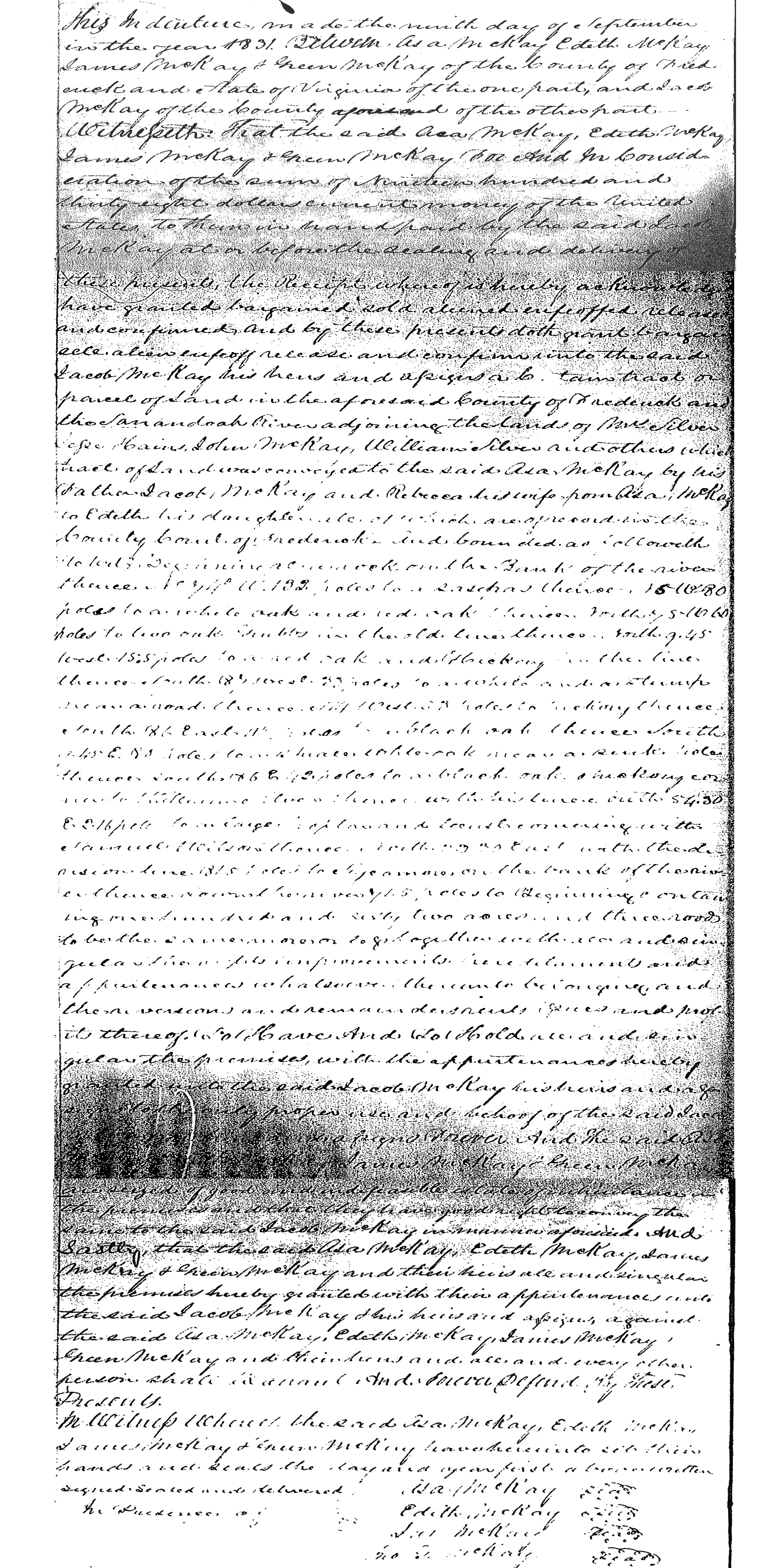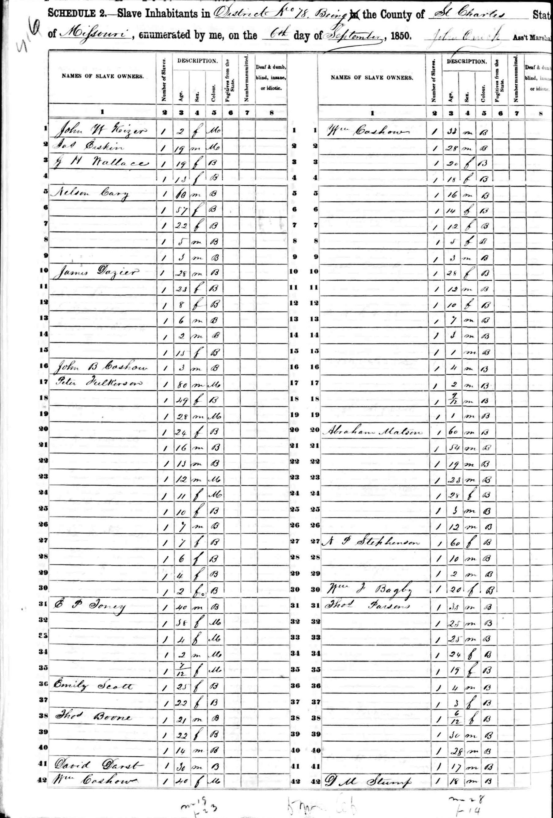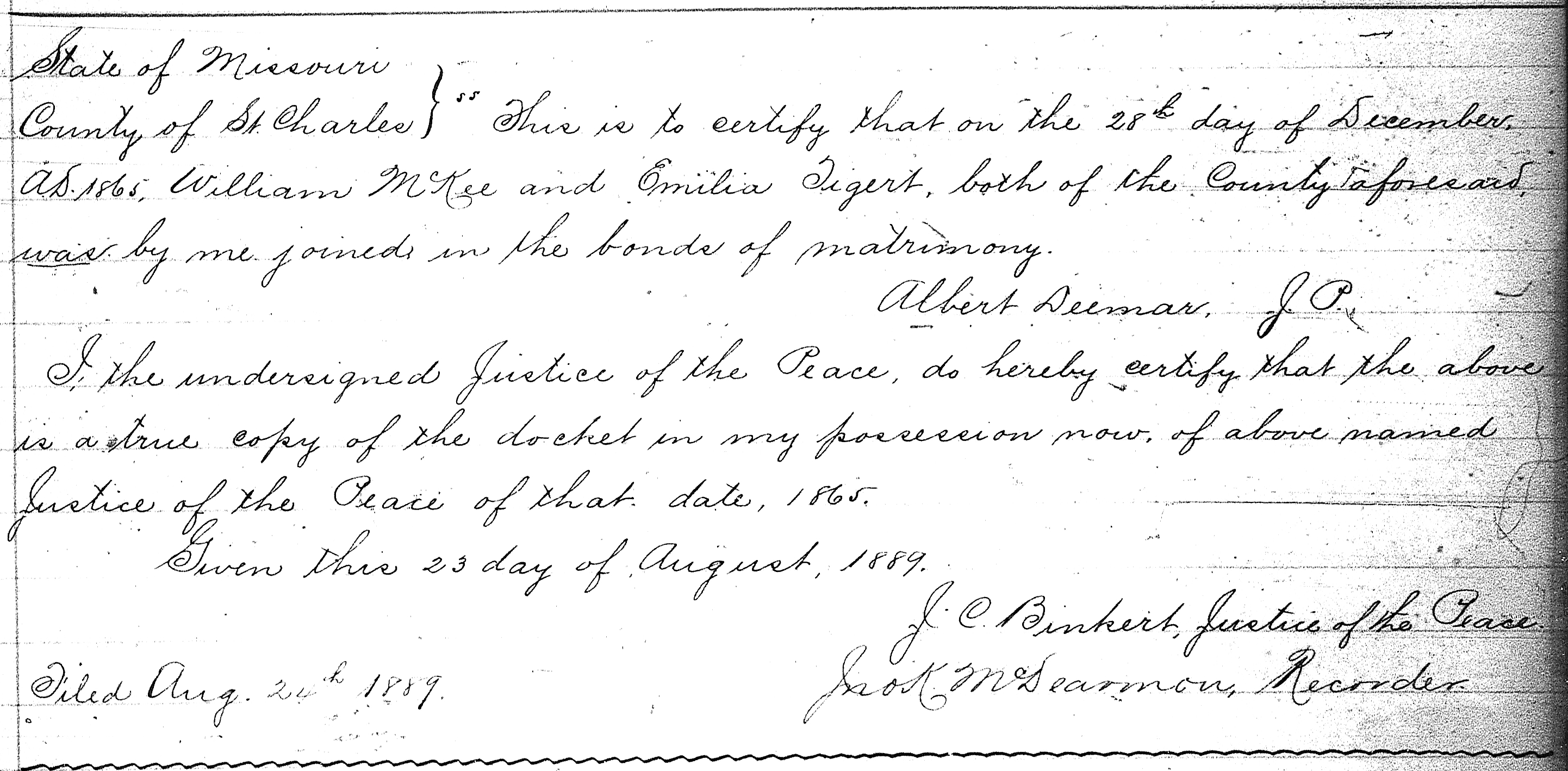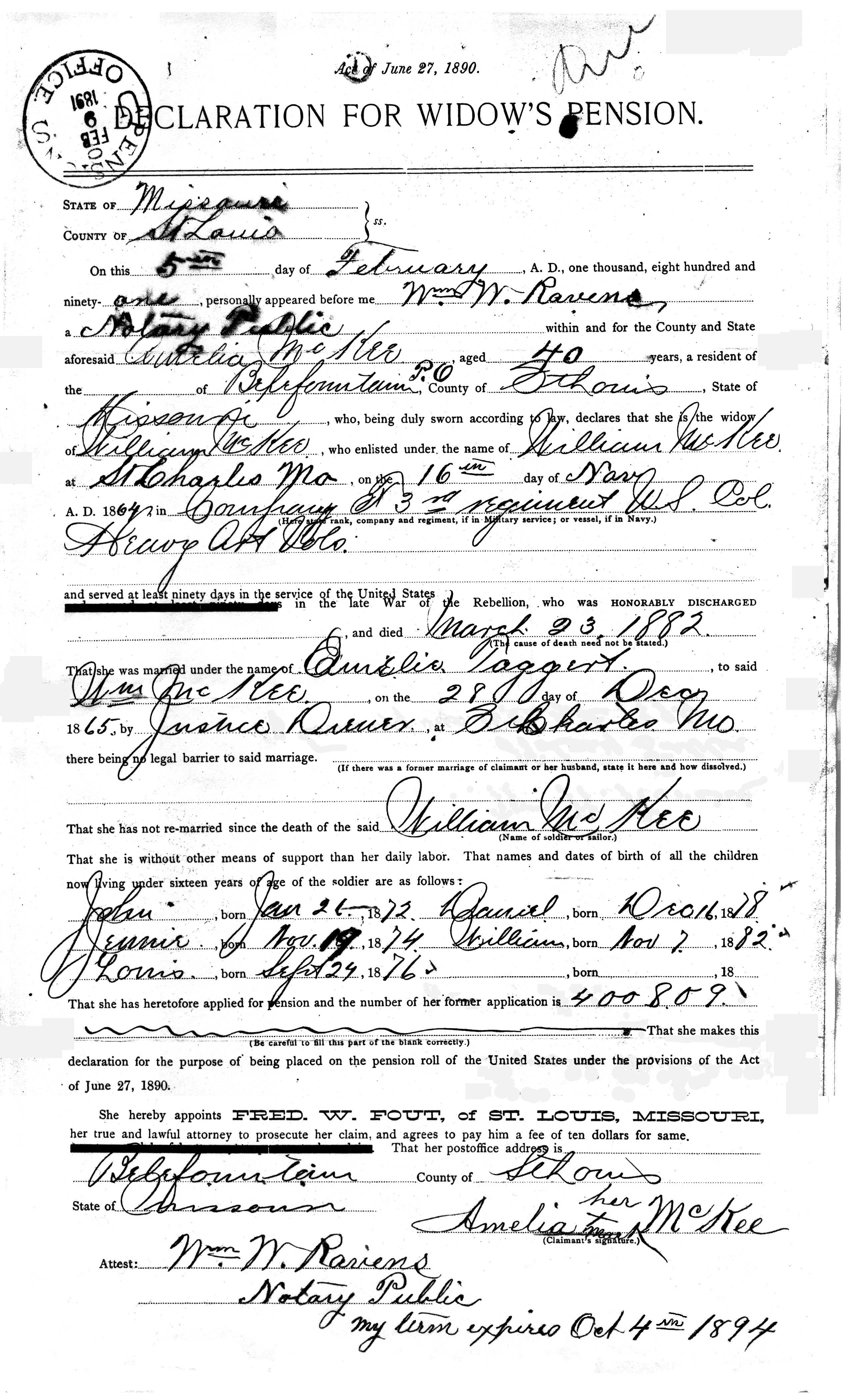 [Home] [Robert Mackay Clan Links and Information] [The Origins of William McKay & Family]The Origins of William McKay & Family (Page 16)Documents1831 James M. McKay Land Purchase Certificate 21 Nov 1831 1831 James M. McKay Land Purchase Receipt 1831 deeds of sale Dee Ann identified in the Forum Oct. 29, 2008 in which Asa McKay, Edith McKay & John Green McKay sold their land to Jacob McKay and Samuel Wilson on 9 September 1831. James and Edith bought their land in St. Charles, Missouri on 28 Nov 1831. 1831 Asa McKay to Jacob McKay Deed 9 Sep 1831 1831 Asa McKay to Samuel Wilson Deed 9 Sep 1831 Edith McKay's marriage in 1833. 1833 Edith McKay and Archibald Caruthers Marriage James M. McKay's Patent 1835 James M. McKay Land Purchase Patent 2 September 1835 Rosina Pfaar Immigration record 1840 Census for Jas McKay in Cuivre Township, St. Charles County James and Rosinah's Marriage license 1841 James McKay and Rosinah Pfarr Marriage 19 October 1841 1842 medical bill for James McKay prior to his death sometime on or after February 14th 1842 James McKay Medical Billing Rosina McKay named administrator of James McKay's estate and his sister, Edy Caruthers and brother, John Green McKay are identified 1842 Rosina McKay Administrator 17 March 1842 James McKay estate inventory--William (Bill), his mother Harriet and sister Margaretha, are identified on pg. 2 1842 James McKay Inventory (page 1) 25 March 1842 1842 James McKay Inventory (page 2) 25 March 1842 1842 James McKay Inventory (page 3) 25 March 1842 James McKay's widow's (Rosina) marriage to John Keiser in 1843. 1843 John Kiser and Rosina McKay Marriage John Keiser requested partition of slaves between James McKay's widow and child, Mary Ann in 1847. 1847 John Keiser Partition Request The partition distribution names the slaves in 1847--"Boy Bill" is distributed to Mary Ann. 1847 Slave Partition and Distribution The partition distribution is approved by Robert Miller P. C. judge. 1847 Slave Partition Probate Approval Inventories of Mary Ann McKay's property and administrative charges in 1849 1849 Mary McKay Inventory Charges 1849 Mary McKay Inventory Property 1850 census for Edith McKay Caruthers and John G. McKay 1850 Edith and A. R. Caruthers & John G. McKay Census 1850 census for John & Rosina Keiser and Mary Ann McKay John Wm. Keiser and Mary Ann McKay Census 1850 slave schedule for "John W. Keizer"--p.1 is William (12 year old male), Margaretha (7 year old female), p.2 is Elisa (2 year old female) Slaves for "Margt Taggart" are also listed on p.1--some or all of the Taggart slaves became the property of Robert Miller who was identified as the father of William's wife, Amelia Taggart McKay 1850 John W. Keizer Slave Schedule (part 1) 1850 John W. Keizer Slave Schedule (part 2) 1852 William's sister Margaretha died in St. Louis, apparently while serving George Keiser--the brother or other relative of John Keiser. 1855 & 1857 Slave & property tax bills for William, Elisa and 240 acres of land. 1855 Slave and Property Tax December 1857 Slave and Prop Tax December 1860 census for John & Rosina Keiser and Mary Ann McKay. 1860 John W. Keiser Mary Ann McKay Census 1860 slave schedule with "Mary Ann McCay" the owner of a 20 year old male and 12 year old female (William & Elisa). 1860 MAry Ann McCay Slave Schedule 1864-1865 William's enlistment into the U.S. Army and muster records in the McKee surname for F Company, 3rd Regiment, U.S. Colored Troops, Heavy Artillery. 1864 USCT Descriptive List William McKee Picture of William McKee's name on plaque A-8 at African American Civil War Memorial in Washington D.C.--which honors over 209,000 "Colored" soldiers and sailors who served the Union. 1865 St. Charles County marriage record--not recorded until 1889; official copy 1865 William McKee and Emilia Tigert Marriage 1870 census for William McKay--wife's name "Ella", Ballwin, St. Louis County 1880 census for William McKay--wife's name "Jane", Bonhomme Township, St. Louis County 1889 & 1891 Amelia McKee's Widow's Pension Declarations 1889 Widows Pension Declaration 1889 Widows Pension Marriage Record 1891 Widows Pension Declaration 1900 census for Amelia McKee and sons John, William, Dan (my grandfather) and Louis 1900 Emilia McKee and sons Census 1916 Letter sent by "Jennie McKee" to Dept. of Interior notifying them that Amelia McKee had died and "Jennie McKay" as informant on "Amelia McKay's" two death certificates. The death certificates also show her father to be Robert Miller. 1916 Widows Pensioner Deceased 1916 Amelia McKay Deceased (1) 1916 Amelia McKay Deceased (2) 1917 death certificate for Mary Ann McKay Hillenkamp, the daughter of James McKay 1917 Mary Ann McKay Hillenkamp Deceased 1920 census of my grandparents, Daniel & Elizabeth (Lizzie) McKay, with my father Julius and his siblings--Maryland Heights, St. Louis County, Missouri 1942 death certificate of my grandfather Daniel McKay--the informant was my Aunt Sophia and she indicated that Daniel's father, William, was born in Germany. I believe this myth was created because William grew up in a household and community of German immigrants and he probably learned German language and culture which caused his descendants to mistakenly believe William was German. Sophia also stated that Amelia's maiden name was "Mueller" which seems to be the German spelling of "Miller." 1860 census and slave schedule for Robert Miller--identified as the father of Amelia Taggart (aka Miller) McKay Robert Miller 1860 Slave Schedule