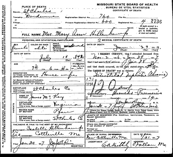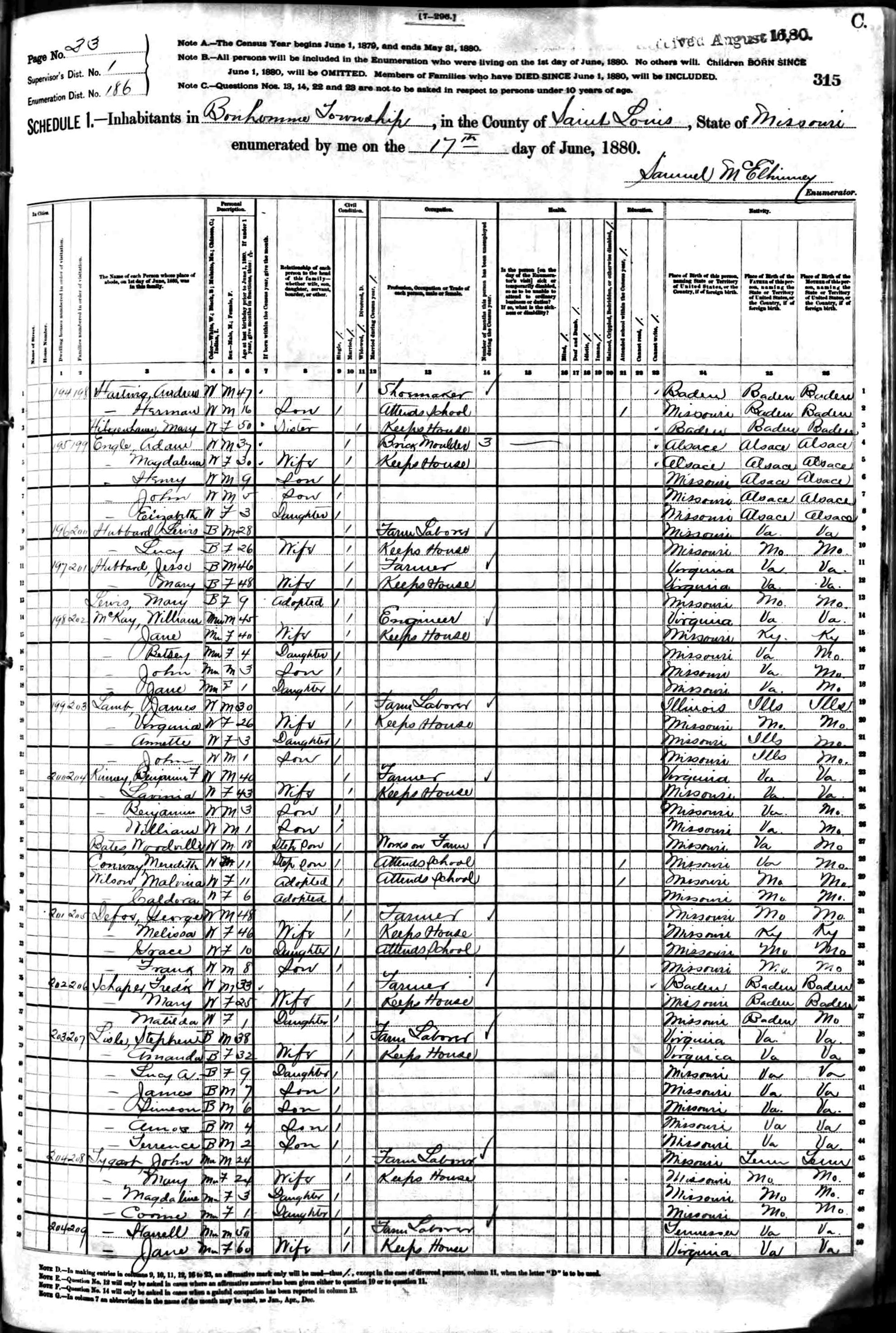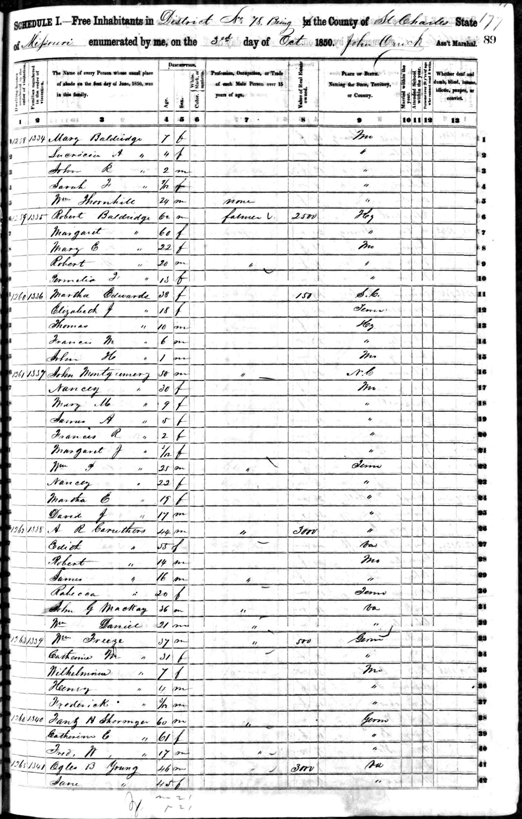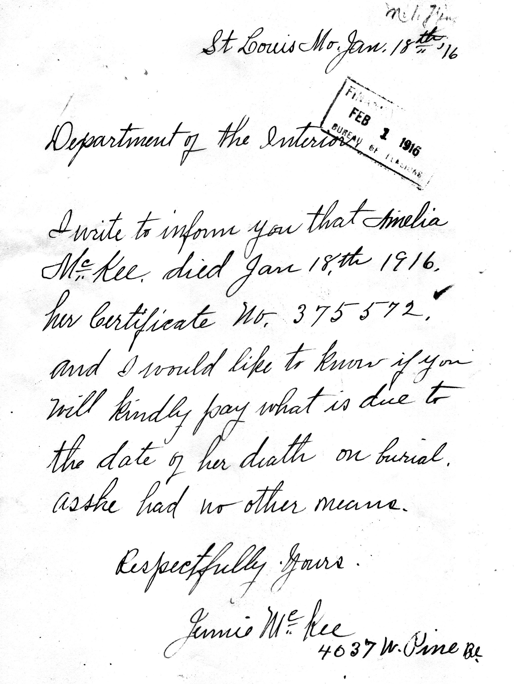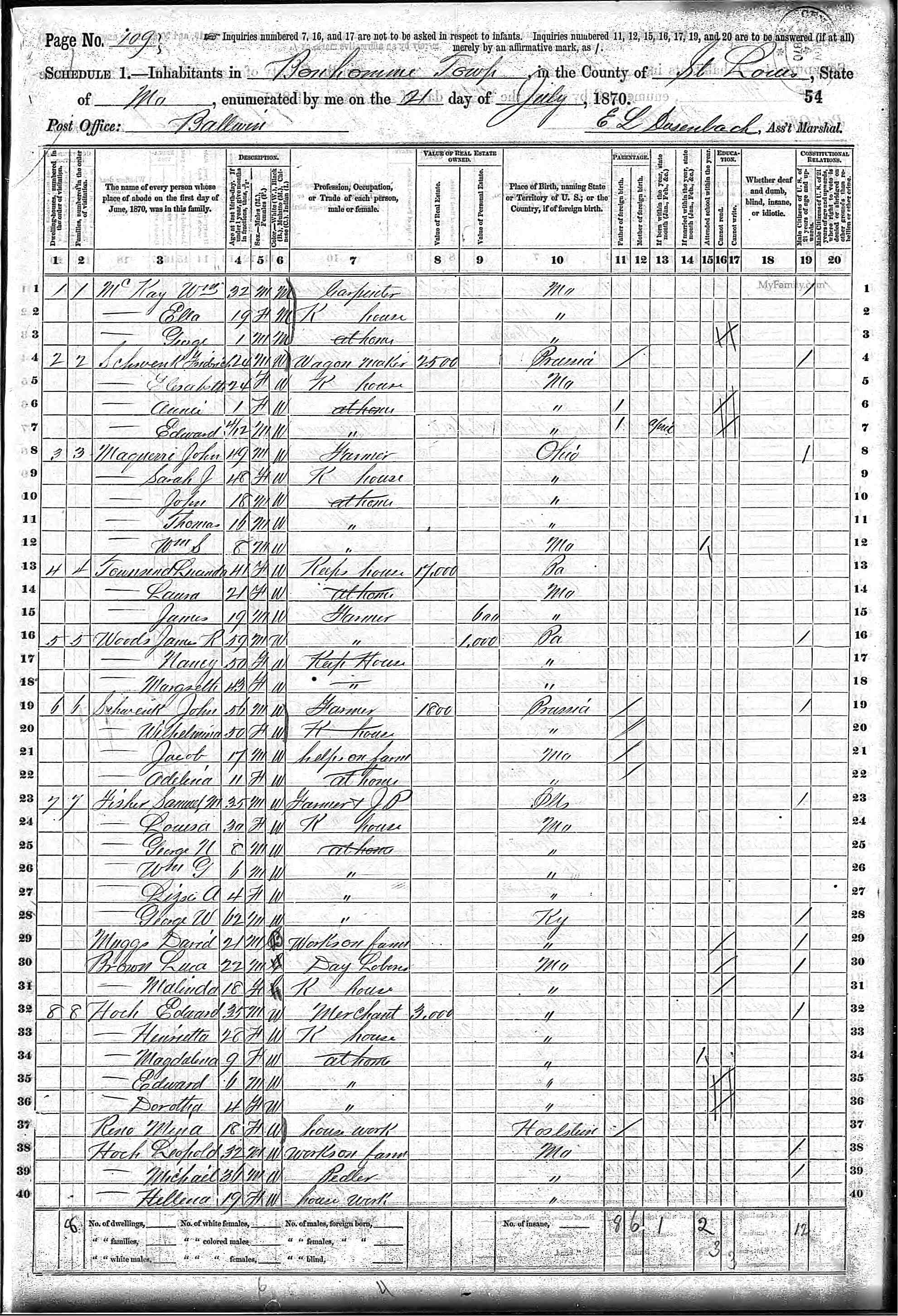 [Home] [Robert Mackay Clan Links and Information] [The Origins of William McKay & Family]The Origins of William McKay & Family (Page 16)Documents1831 James M. McKay Land Purchase Certificate 21 Nov 1831 1831 James M. McKay Land Purchase Receipt 1831 deeds of sale Dee Ann identified in the Forum Oct. 29, 2008 in which Asa McKay, Edith McKay & John Green McKay sold their land to Jacob McKay and Samuel Wilson on 9 September 1831. James and Edith bought their land in St. Charles, Missouri on 28 Nov 1831. 1831 Asa McKay to Jacob McKay Deed 9 Sep 1831 1831 Asa McKay to Samuel Wilson Deed 9 Sep 1831 Edith McKay's marriage in 1833. 1833 Edith McKay and Archibald Caruthers Marriage James M. McKay's Patent 1835 James M. McKay Land Purchase Patent 2 September 1835 Rosina Pfaar Immigration record 1840 Census for Jas McKay in Cuivre Township, St. Charles County James and Rosinah's Marriage license 1841 James McKay and Rosinah Pfarr Marriage 19 October 1841 1842 medical bill for James McKay prior to his death sometime on or after February 14th 1842 James McKay Medical Billing Rosina McKay named administrator of James McKay's estate and his sister, Edy Caruthers and brother, John Green McKay are identified 1842 Rosina McKay Administrator 17 March 1842 James McKay estate inventory--William (Bill), his mother Harriet and sister Margaretha, are identified on pg. 2 1842 James McKay Inventory (page 1) 25 March 1842 1842 James McKay Inventory (page 2) 25 March 1842 1842 James McKay Inventory (page 3) 25 March 1842 James McKay's widow's (Rosina) marriage to John Keiser in 1843. 1843 John Kiser and Rosina McKay Marriage John Keiser requested partition of slaves between James McKay's widow and child, Mary Ann in 1847. 1847 John Keiser Partition Request The partition distribution names the slaves in 1847--"Boy Bill" is distributed to Mary Ann. 1847 Slave Partition and Distribution The partition distribution is approved by Robert Miller P. C. judge. 1847 Slave Partition Probate Approval Inventories of Mary Ann McKay's property and administrative charges in 1849 1849 Mary McKay Inventory Charges 1849 Mary McKay Inventory Property 1850 census for Edith McKay Caruthers and John G. McKay 1850 Edith and A. R. Caruthers & John G. McKay Census 1850 census for John & Rosina Keiser and Mary Ann McKay John Wm. Keiser and Mary Ann McKay Census 1850 slave schedule for "John W. Keizer"--p.1 is William (12 year old male), Margaretha (7 year old female), p.2 is Elisa (2 year old female) Slaves for "Margt Taggart" are also listed on p.1--some or all of the Taggart slaves became the property of Robert Miller who was identified as the father of William's wife, Amelia Taggart McKay 1850 John W. Keizer Slave Schedule (part 1) 1850 John W. Keizer Slave Schedule (part 2) 1852 William's sister Margaretha died in St. Louis, apparently while serving George Keiser--the brother or other relative of John Keiser. 1855 & 1857 Slave & property tax bills for William, Elisa and 240 acres of land. 1855 Slave and Property Tax December 1857 Slave and Prop Tax December 1860 census for John & Rosina Keiser and Mary Ann McKay. 1860 John W. Keiser Mary Ann McKay Census 1860 slave schedule with "Mary Ann McCay" the owner of a 20 year old male and 12 year old female (William & Elisa). 1860 MAry Ann McCay Slave Schedule 1864-1865 William's enlistment into the U.S. Army and muster records in the McKee surname for F Company, 3rd Regiment, U.S. Colored Troops, Heavy Artillery. 1864 USCT Descriptive List William McKee Picture of William McKee's name on plaque A-8 at African American Civil War Memorial in Washington D.C.--which honors over 209,000 "Colored" soldiers and sailors who served the Union. 1865 St. Charles County marriage record--not recorded until 1889; official copy 1865 William McKee and Emilia Tigert Marriage 1870 census for William McKay--wife's name "Ella", Ballwin, St. Louis County 1880 census for William McKay--wife's name "Jane", Bonhomme Township, St. Louis County 1889 & 1891 Amelia McKee's Widow's Pension Declarations 1889 Widows Pension Declaration 1889 Widows Pension Marriage Record 1891 Widows Pension Declaration 1900 census for Amelia McKee and sons John, William, Dan (my grandfather) and Louis 1900 Emilia McKee and sons Census 1916 Letter sent by "Jennie McKee" to Dept. of Interior notifying them that Amelia McKee had died and "Jennie McKay" as informant on "Amelia McKay's" two death certificates. The death certificates also show her father to be Robert Miller. 1916 Widows Pensioner Deceased 1916 Amelia McKay Deceased (1) 1916 Amelia McKay Deceased (2) 1917 death certificate for Mary Ann McKay Hillenkamp, the daughter of James McKay 1917 Mary Ann McKay Hillenkamp Deceased 1920 census of my grandparents, Daniel & Elizabeth (Lizzie) McKay, with my father Julius and his siblings--Maryland Heights, St. Louis County, Missouri 1942 death certificate of my grandfather Daniel McKay--the informant was my Aunt Sophia and she indicated that Daniel's father, William, was born in Germany. I believe this myth was created because William grew up in a household and community of German immigrants and he probably learned German language and culture which caused his descendants to mistakenly believe William was German. Sophia also stated that Amelia's maiden name was "Mueller" which seems to be the German spelling of "Miller." 1860 census and slave schedule for Robert Miller--identified as the father of Amelia Taggart (aka Miller) McKay Robert Miller 1860 Slave Schedule